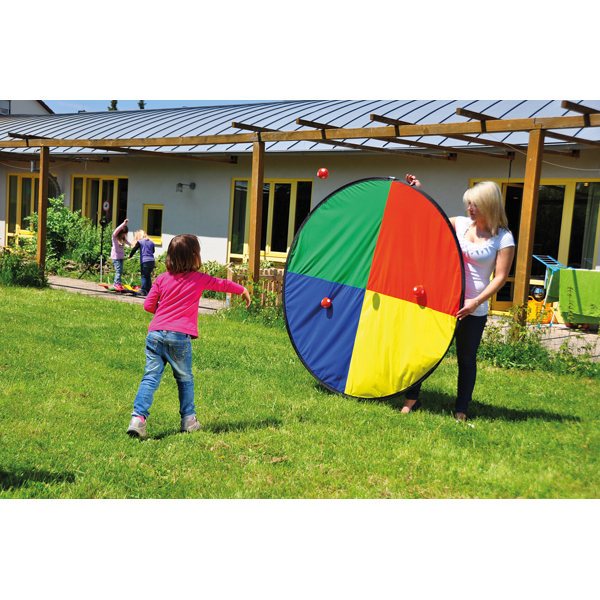 6 шаров прилипают к четырехцветной мишени в соответствии с точками клеточки. 3 красных и 3 синих шара помещаются в сумку для переноски Ø 40 см вместе с мишенью.