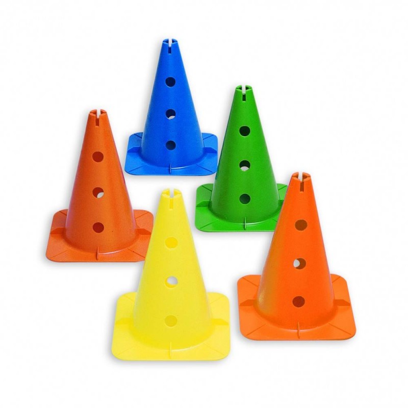 Конус имеет 6 отверстий (по 3 с двух сторон), предназначенных для создания различных конструкций в сочетании с палочками. Диаметр отверстия 25 мм. На вершине конуса имеются муфты для вставки плоских колец. Конусы изготовлены из прочного, очень гибкого и качественного пластика. Доступен в разных цветах.