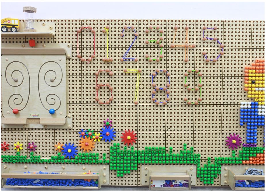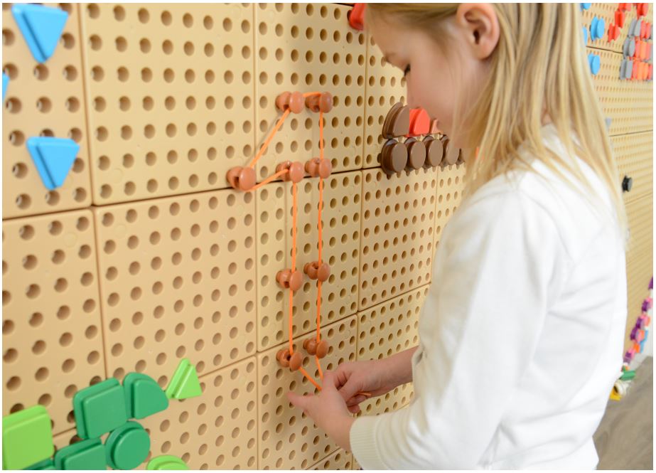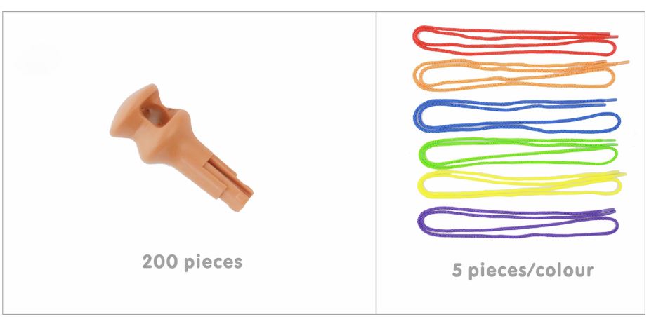 Этот большой набор состоит из 200 колышков для шнуровки и 30 шнурков (каждый длиной 1 метр, 6 ярких основных цветов). Колышки легко вставляются в стену STEM WALL. В головке каждого колышка есть большое отверстие для нанизывания шнурков и создания соединений и узоров между соседними колышками. Дети могут играть в свободном режиме или создавать геометрические узоры, фигуры и даже буквы. Нанизывание шнурков развивает навыки планирования, логического мышления, улучшает координацию движений и мелкую моторику.