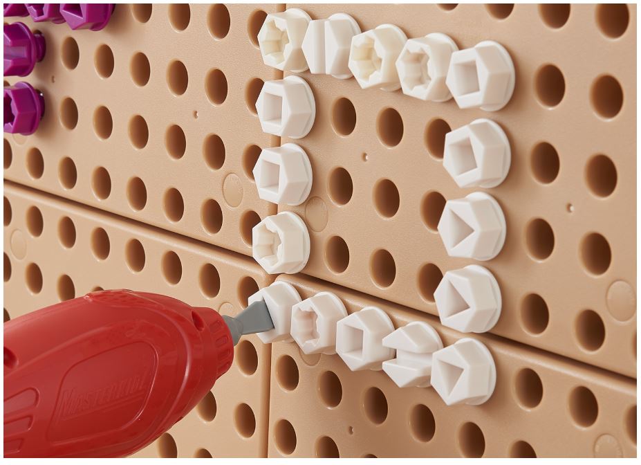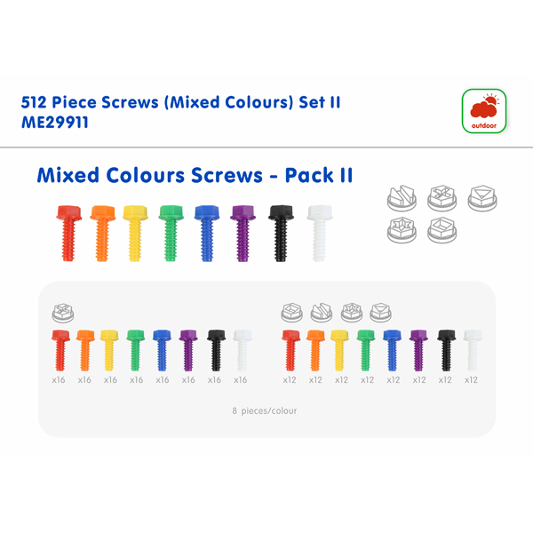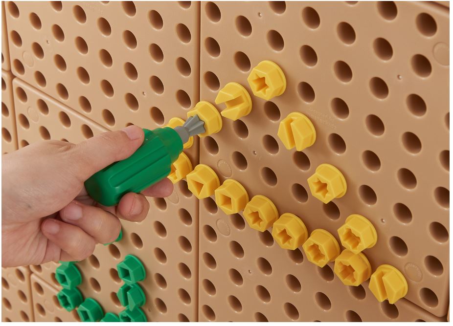 Этот удивительный набор из 512 болтов позволяет детям создавать картинки, узоры или последовательности, используя электрическую отвертку для быстрого и легкого закручивания болтов разных цветов в любую STEM-стену или STEM-стол. Однако, что делает этот набор еще интереснее, так это 8 болтов разных цветов с 5 различными вариантами головок, подходящими для отверток разной формы. Детям нужно будет выбрать подходящую отвертку (продается отдельно) в качестве насадки к головке болта. Процесс требует от детей придумать дизайн, который они хотят создать, выбрать болт нужного цвета, подходящую насадку для отвертки, а затем закрутить его в нужное место. Это включает в себя проектирование, создание узоров, сопоставление, координацию рук и глаз, выбор подходящего инструмента для головки болта и фиксацию с помощью настоящей работающей электрической отвертки (продается отдельно). Это практическое STEM-образование в действии! В комплекте: винты различных типов, всегда 8 цветов: крестообразные (8x16=128), с прорезью, квадратные, звездообразные и треугольные (по 8x12=96 штук каждого типа).