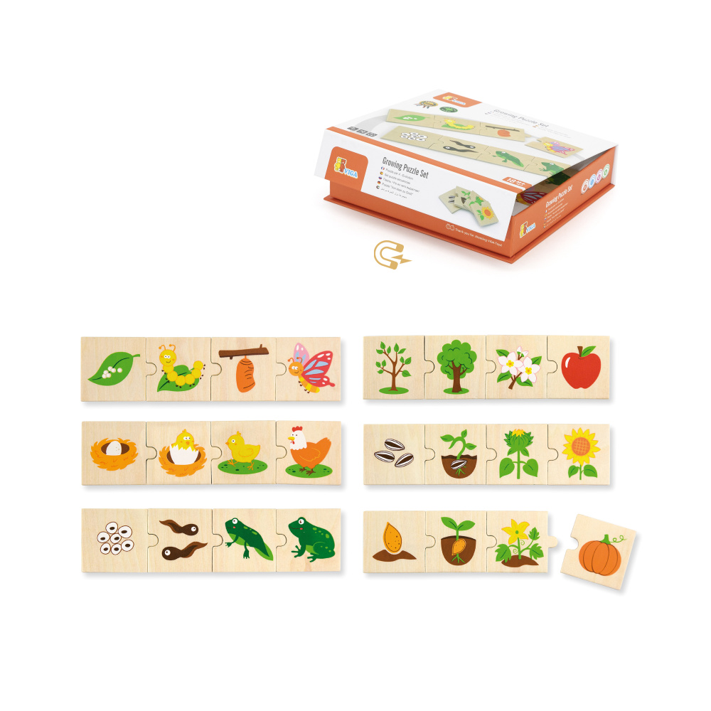 Новый набор пазлов призван развить у детей память, аналитические способности и критическое мышление. В набор входят 24 деревянных элемента пазла с изображениями растений, животных и насекомых. Познакомьтесь с процессами их роста.